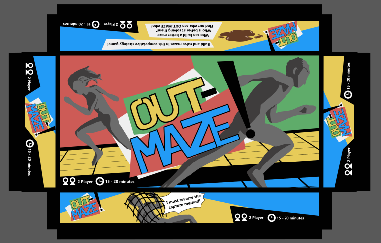 The box was the next step. I made a quick logo based on the colors used on the board and added a tagline on one of the sides. I struggles for a bit with the bottom half of the box however and was unsure of what I could fill the space with. After some time though I decided to use it as an additional place to record the rules of the game. I laid out colored block in the same rough orientation as the board is and wrote the rules for the first phase of play on the corresponding side of the board and did the same for the second. I then made a duplicate of the board and rotated it so both players could have the box base next to the board while playing and refer to it for the rules when needed. The sides or the bottom half of the box cover the effects of the obstacles as well as the game’s win condition.