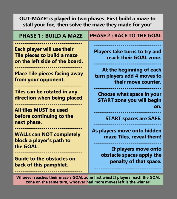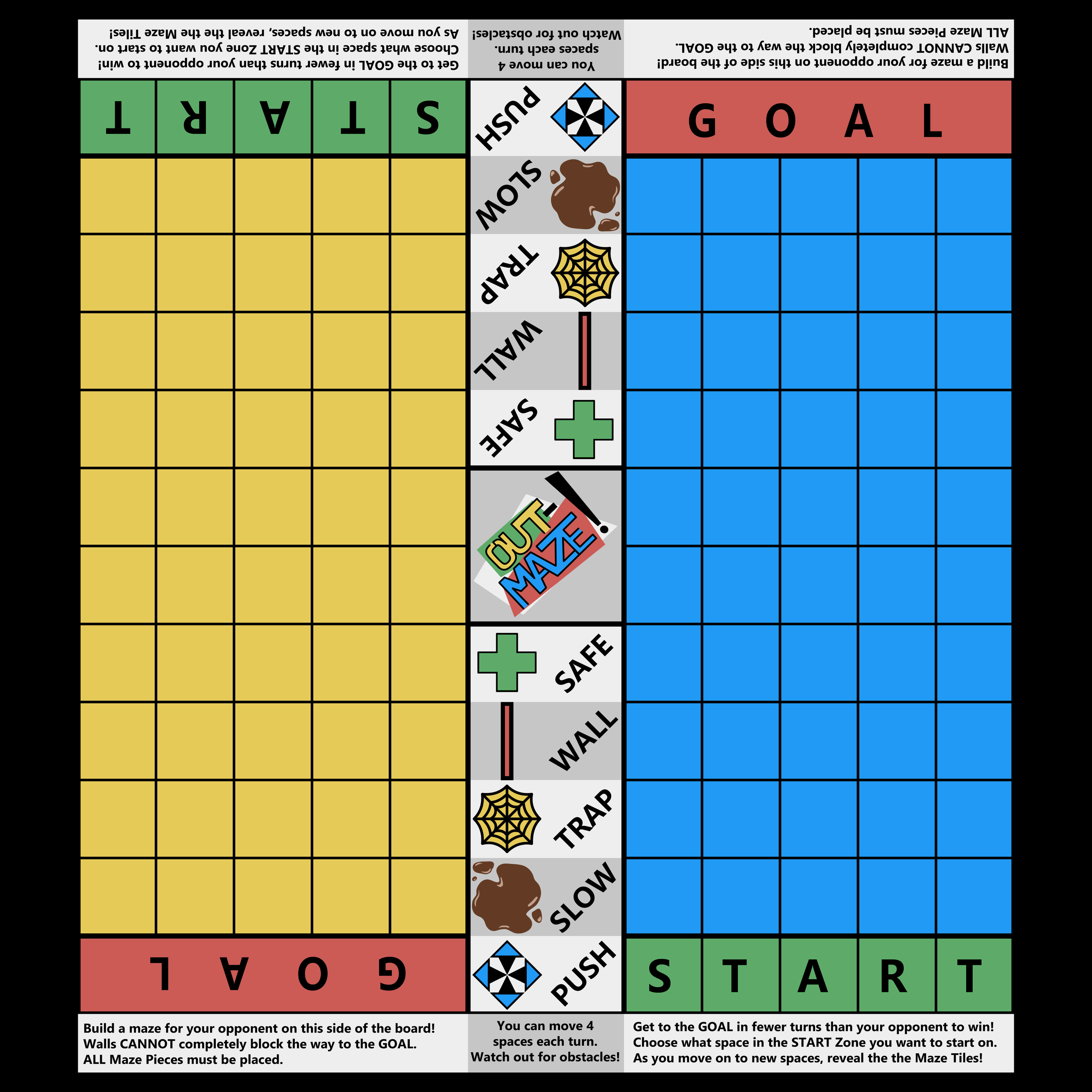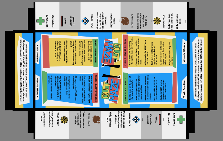 I began with the board itself and made sure that the colors and layout of the board were simple and easy to read. At either end of the board are basic summaries of what is done on either side of the board, the player’s left being for where they build their maze, and the right being for where they play the maze made by their opponent. Between these is a reminder of the moves each player has on each turn that is adjusted after the printing process which I will cover later on this page. The central section of the board where each side is separated provides a legend of the various obstacles for reference.